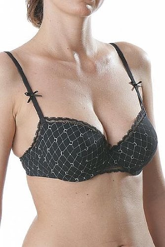Seamed, underwire, contour cups. Stretch microfiber. Lightly-lined cups prevent show-through. Demi cups provide moderate coverage and full support. Non-stretch center provides additional support. Pretty monogram print. Sweet bow details. A cups feature removable push-up pads. Adjustable back straps. T-shirt bra - virtually disappears under thin fabrics. Columns and rows increase with size. 1 column, 1 row hook and eye back closure